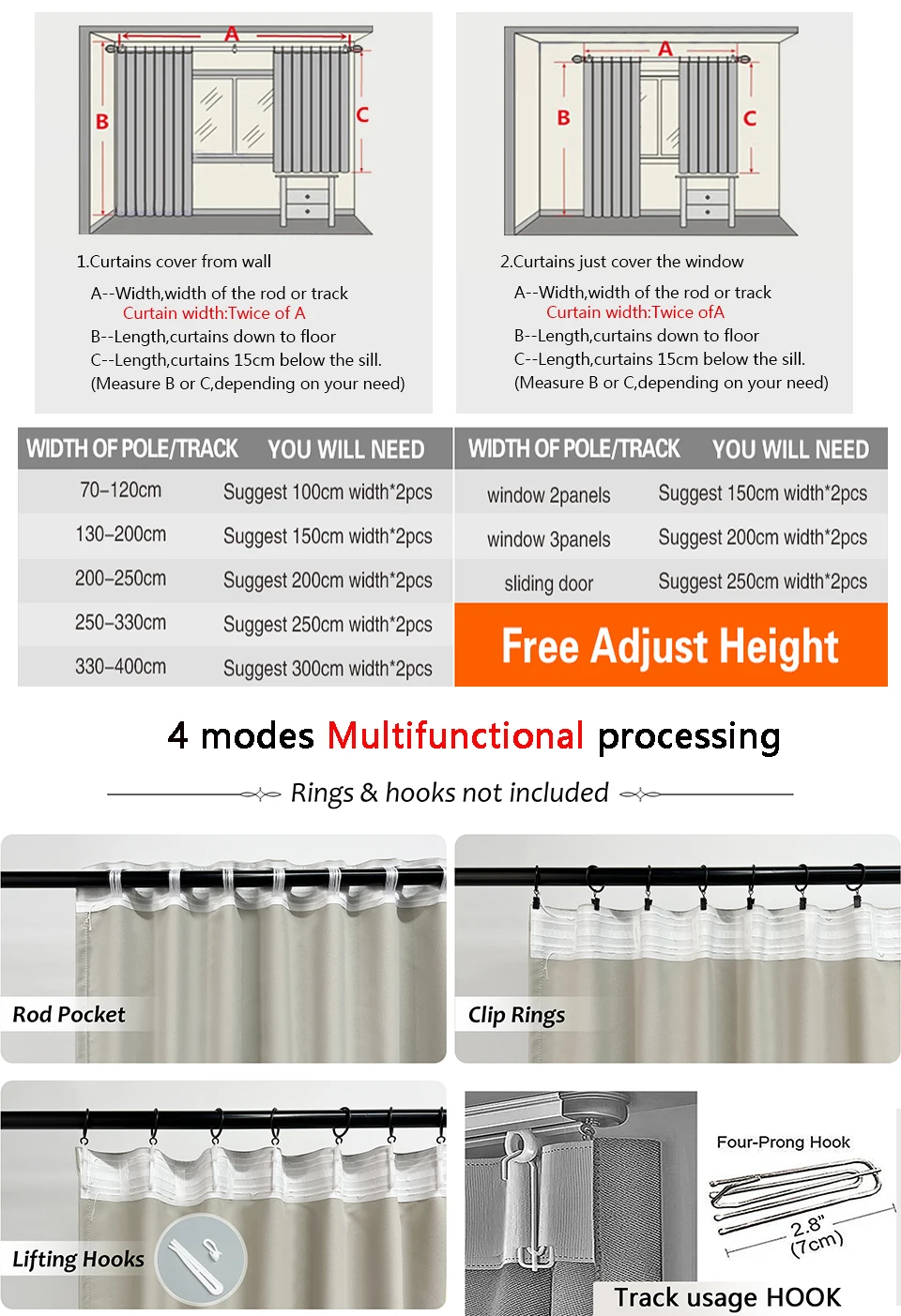 --2. Size: W = Width ,usually curtain's width = 2 times Curtain rod or rail . H/L = Height ,free to adjust, Max is 2.65 meters.
