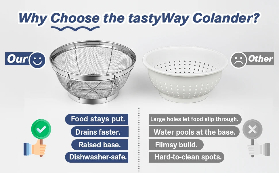 【Versatile Use】: This stainless steel colander is suitable for various kitchen tasks, such as washing vegetables and rice.